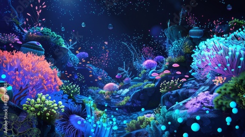Fototapeta premium Neon Sci-Fi Wonderland: Underwater Coral Reef Bioluminescence