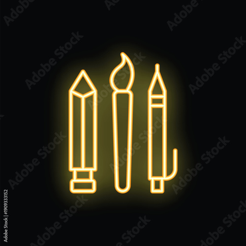 Fototapeta premium Neon sign depicting art supplies glowing yellow on a black background