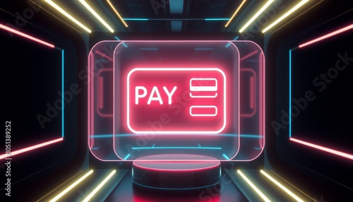 © ekalaila, Obraz premium Neon Sign Displaying "Pay" with Credit Card Icon in a Futuristic Setting