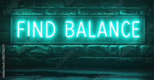 Fototapeta premium Neon sign displays Find Balance. Dark brick wall provides backdrop. Teal glow...