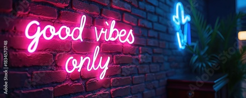 © Vadym, Fototapeta premium Neon sign displays phrase good vibes only on brick wall. Pink glowing text gives positive message. Blue light sign complements overall mood. Modern inspirational artwork concept.