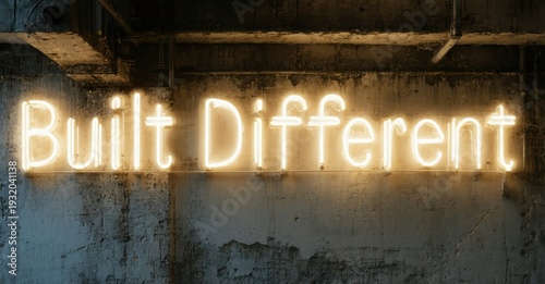 Fototapeta premium Neon sign displays text Built Different against textured concrete wall. Dim lighting creates dramatic effect. Simple, bold message.