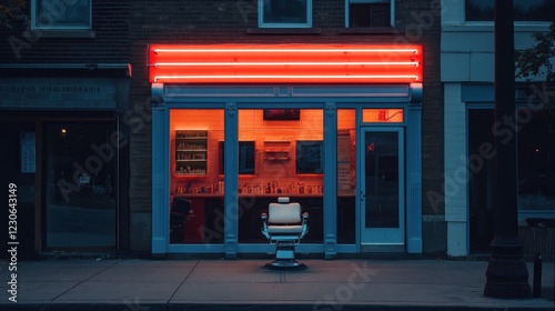 © Penatic Studio, Naklejka premium Neon Sign Illuminates Empty Barbershop Chair