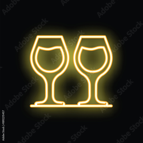 Fototapeta premium Neon sign of two wine glasses glowing yellow on black background