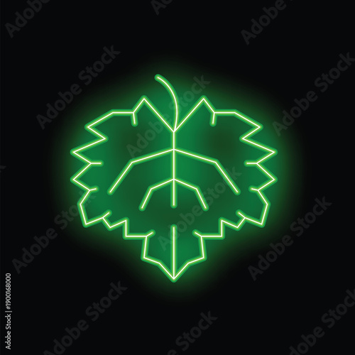 © ylivdesign, Naklejka premium Neon sign representing a grape leaf, glowing green on a black background