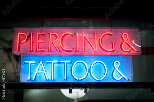 © Konstantin Yolshin, Naklejka premium Neon signboard with Piercing & Tattoo at night.