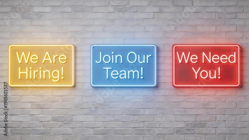 Fototapeta premium Neon signs on brick wall hiring message