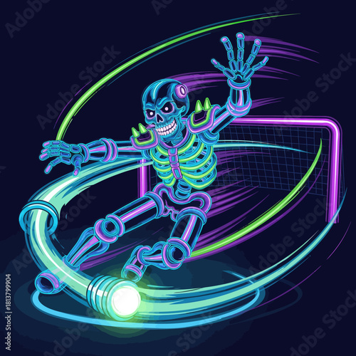 © Fahri, Obraz premium Neon Skeleton Playing Hockey with Glowing Puck and Goal.