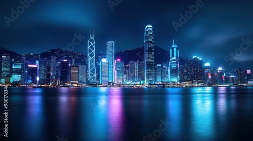 © ZENTHRA, Fototapeta premium Neon Skyline Reflections of a Modern City at Night with Vibrant Lights Over Calm Water