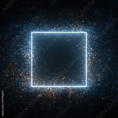 Fototapeta premium neon square frame, surrounded by dynamic, swirling blue, orange digital particles against dark background. Ideal for technology, abstract backgrounds, digital portals, cinematic effects