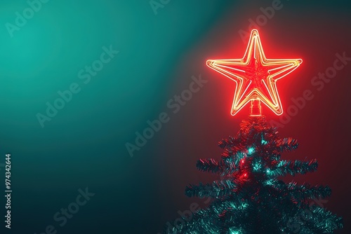 Fototapeta premium Neon star atop Christmas tree, red glow against blue