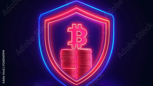 © Athirat, Fototapeta premium Neon style shield icon with a stack of coins, signifying the need for robust financial protection and wealth safeguarding.