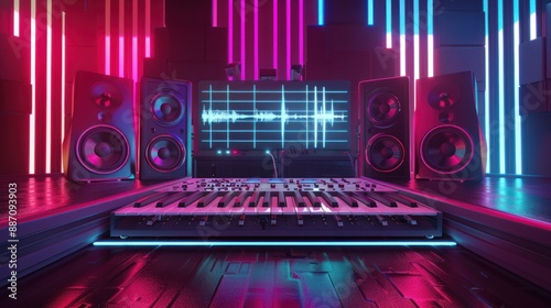 © Anak, Obraz premium Neon Synth Studio with Keyboard and Speakers