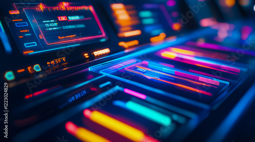 Obraz premium Neon Tech Interface: Futuristic Dashboard Display with Glowing Lines and Data...