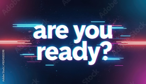 © Vadym, Naklejka premium Neon text asks are you ready. Bright light lines with glitch effect on dark background. Question implies challenge or opportunity for future growth.
