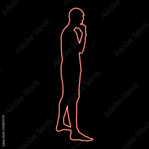 Fototapeta premium Neon thinking man standing silhouette pensive person side view icon red color...