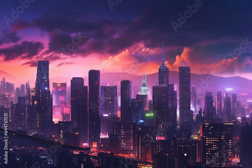 Fototapeta premium Neon towers and skyscrapers in purple lights
