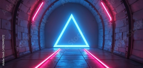 © Vadym, Fototapeta premium Neon triangle glows in futuristic tunnel. Pink and blue lights illuminate stone walls and tiled floor. Sci-fi pathway leads to digital metaverse. Interior with geometric shapes.