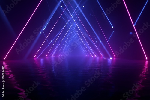 © olegganko, Fototapeta premium Neon Triangle Lights Create a Vibrant Tunnel Effect in a Dark Space