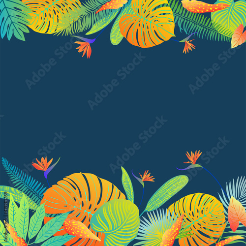 © vaneeva, Naklejka premium Neon tropical leaves of palm trees, monstera, fern and other plants. Vector color sketch on a blue background. Ultraviolet blue, turquoise, orange