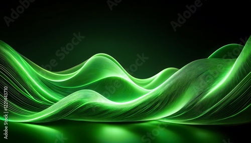 © TJ_Designs, Obraz premium Neon Wave abstract background, Isolated on a dark background, Green Neon wave with glow, Technology, network, internet concept