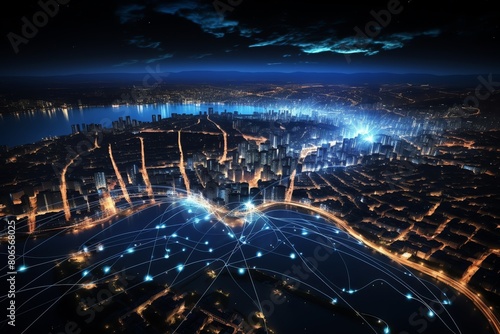 © AlexCaelus, Fototapeta premium Neon web lines across city, night, global network idea, urban digital landscape