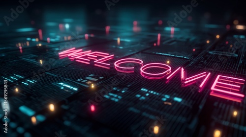 © Azis, Obraz premium Neon Welcome Sign with Digital Future, and Tech Background.