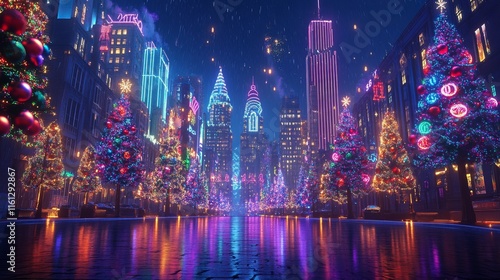 Obraz premium Neon Winter Wonderland: Cityscape with holographic Christmas decorations