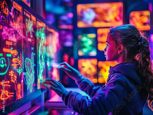 © Bianca, Obraz premium Neon Wonderland: Child Explores Interactive Digital Art