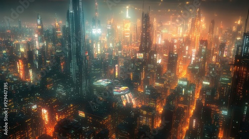 Fototapeta premium neondrenched cyberpunk cityscape towering futuristic skyscrapers with holographic displays flying vehicles and pulsating energy in a night scene