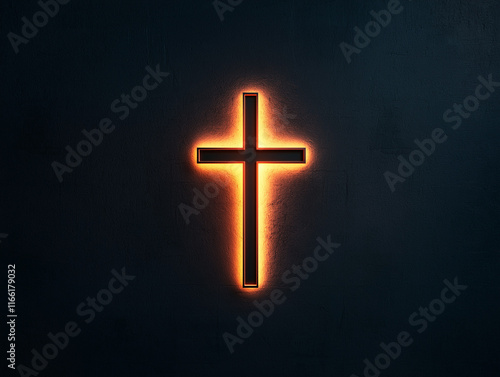 © Cedric, Fototapeta premium Neonkreuz leuchtet an einer minimalistischen Wand in dunkler Umgebung