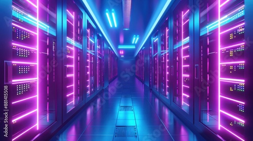 Fototapeta premium Neonlit data center hallway with long stretch of lights and technology...
