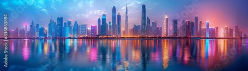 Fototapeta premium Neonlit future city, ethereal skyline reflected in tranquil waters, modern marvel of urban planning and design