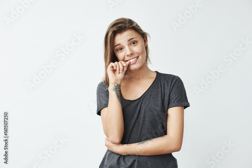 Fototapeta premium Nervous young pretty girl looking at camera biting nails over white background.