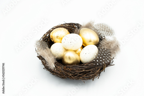 © oldesign, Obraz premium Nest, Easter golden and white eggs