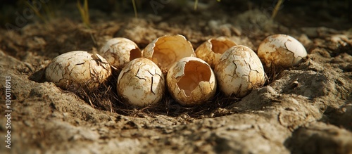 © Gular, Naklejka premium Nest of broken dinosaur eggs scattered in sandy earth with cracked shells showing shades of beige and brown, surrounded by soft grass.
