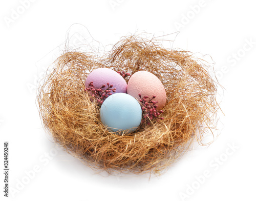 Fototapeta premium Nest with beautiful Easter eggs on white background