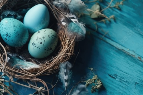 Obraz premium nest with blue eggs on a blue table. Generative AI