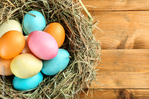 Fototapeta premium Nest with colorful Easter eggs on wooden table, closeup