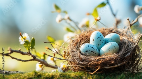 Fototapeta premium Nest with Easter eggs in grass on a sunny spring day. Generative AI.