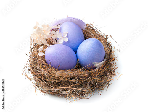 Fototapeta premium Nest with purple Easter eggs isolated on a white background.