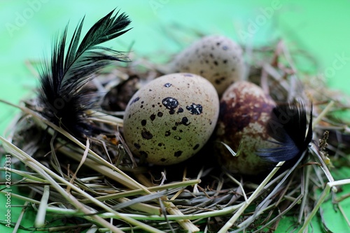 © Romaniia, Fototapeta premium Nest with quail eggs and feathers on light green background.