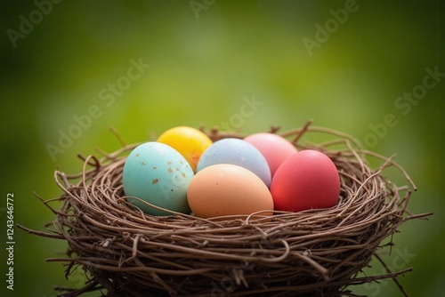 © He, Fototapeta premium nest with six colorful eggs unique speckled patterns