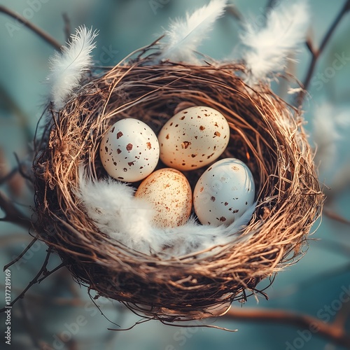 © doaibu, Obraz premium Nest with speckled eggs in a tree