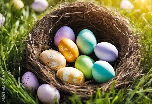 Fototapeta premium "Nestled Beauty: Multiple Colored Easter Eggs in a Charming Background"