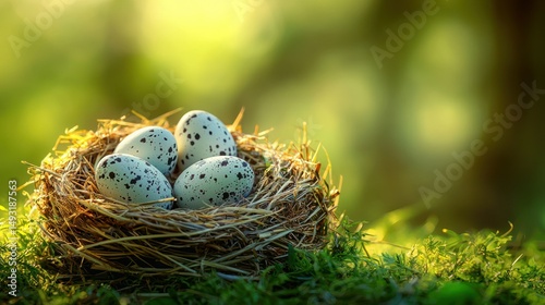 © Dece Std, Fototapeta premium Nestled eggs in a sunlit nest