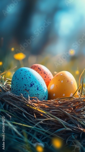 © Kristian, Obraz premium Nestled trio of speckled eggs amid glowing blossoms