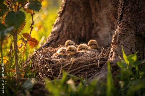 © NeuralNiche, Obraz premium Nestlings of thrush birds in their home