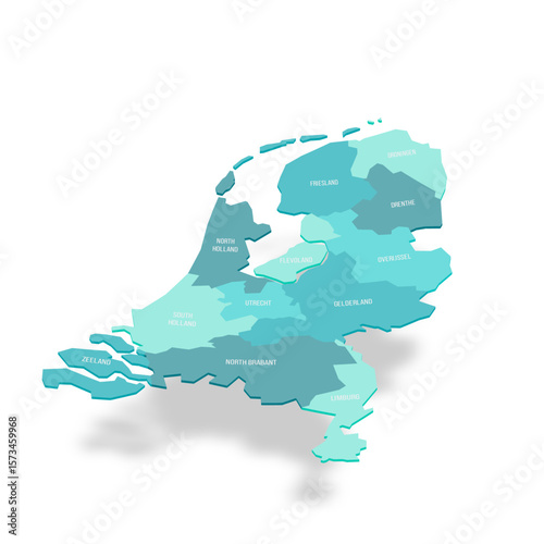 © pyty, Obraz premium Netherlands political map of administrative divisions - provinces. 3D turquoise vector map with name labels.
