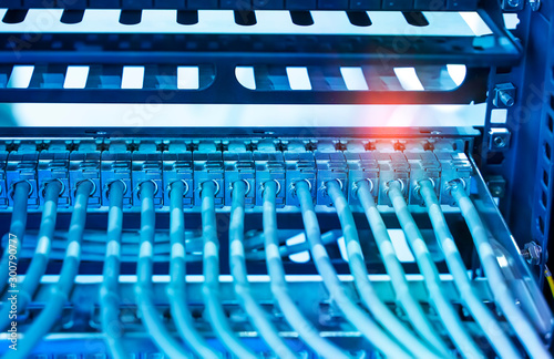 Fototapeta premium Network cable in switch and firewall in cloud computing data center server rack